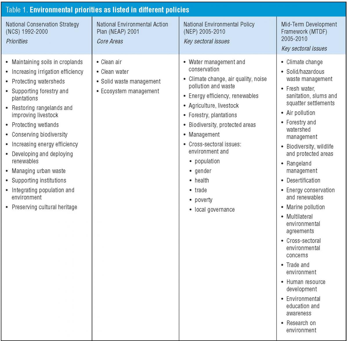 The National Environmental Policy 20055 and Mid-Term Development Framework 2005-20106 are other important milestones. The environmental priorities established in these various government policies are summarised in Table 1.