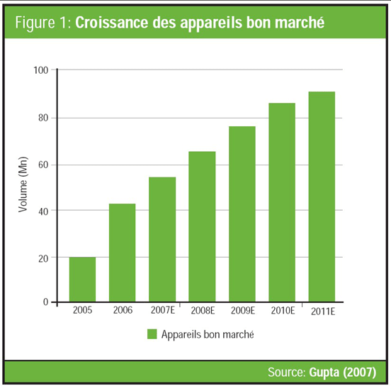 Les fournisseurs de services cellulaires ont aussi réduit les coûts des appareils ainsi que ceux des connexions mobiles. Reliance Communications a été la première à fournir des appareils entre 777 et 888 INR (19 à 23 dollars) (Prabhudesai, 2007), alors que Spice Telecom les offre pour 599 INR (15 dollars). La tendance à regrouper les bas tarifs avec les appareils bon marché représente une activité à faible marge et fort volume. D’ici 2010, le nombre des utilisateurs de mobile en Inde rurale devrait s’élever à 167 millions et ce modèle opérationnel contribuera largement à atteindre ce chiffre. La figure 1 montre le taux de croissance prévu des appareils bon marché en Inde (Gupta, 2007).